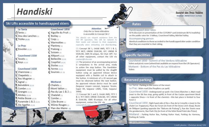 *Please see the list of Handiski Authorised Ski Lifts in the Trois Vallées for full details. Please note: If not accompanied by a handiski instructor, the person in the wheelchair will require someone to assist them in accessing the lifts. This person will be able to claim a discount on their lift pass price.